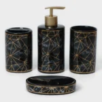 Transform your bathroom into a luxury spa with this stunning 4-piece ceramic set. Featuring a sophisticated black marble print with striking golden geometric lines, this set combines high-end style with everyday functionality.